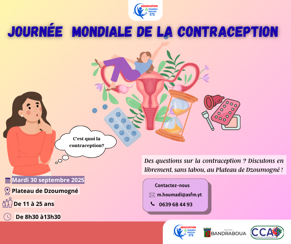 Dans le cadre de la Journée mondiale de la contraception, l’Association Fahamou Maecha, en partenariat avec la Politique de la Ville de Bandraboua et le Centre Communal d’Action Sociale (CCAS) de Dzoumogné, organise une matinée de sensibilisation et d’information sur les méthodes contraceptives.